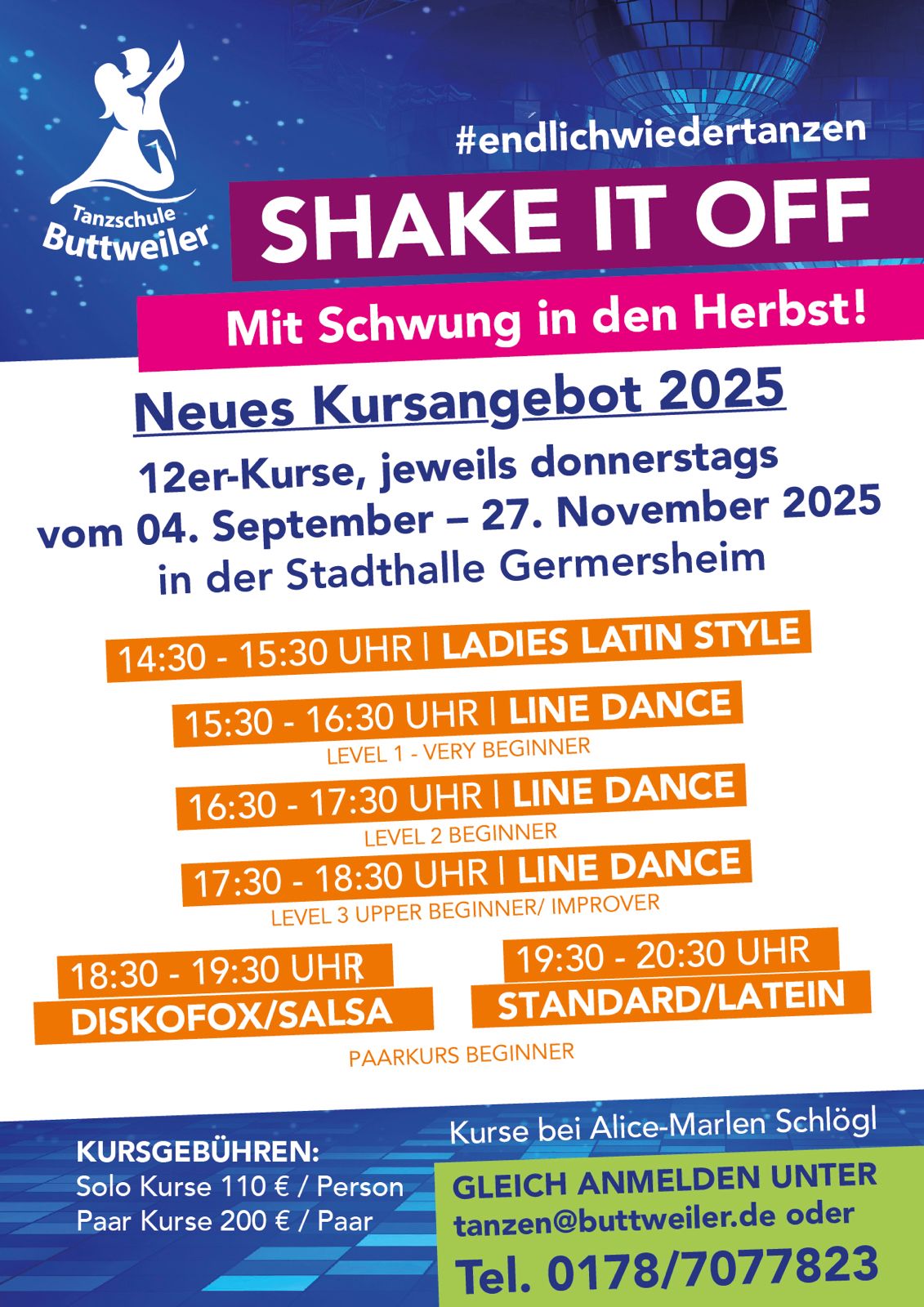 Die Tanzschule Buttweiler in Germersheim steht für Leidenschaft, Gemeinschaft und Freude am Tanzen. Wir bieten bieten eine Vielzahl von Kursen an, die sowohl für Anfänger als auch für Fortgeschrittene geeignet sind. Entdecken Sie unser Angebot von Ladies Latin Style bis hin zu Linedance und finden Sie den Kurs, der zu Ihnen passt.